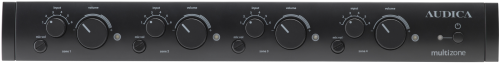 A zone control mixer consisting of 4 zones with 6 music inputs plus a microphone input for paging applications. Each of the 4 outputs can be independently configured to provide music from any one of the inputs plus the paging microphone and the relative levels are set by front panel controls. The music is automatically reduced in level (ducking) to allow for announcements to be heard clearly. Each zone output is mono and all inputs are stereo capable (mixed to mono internally).